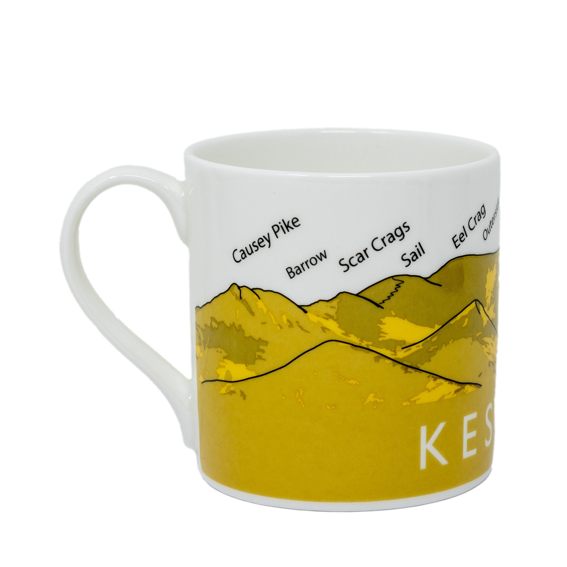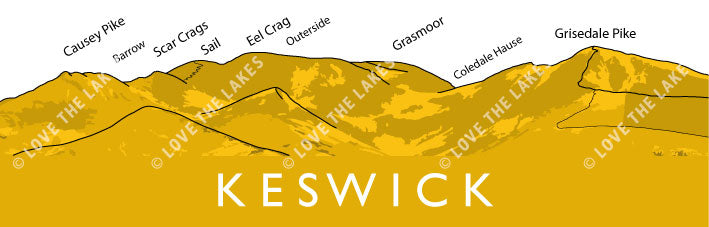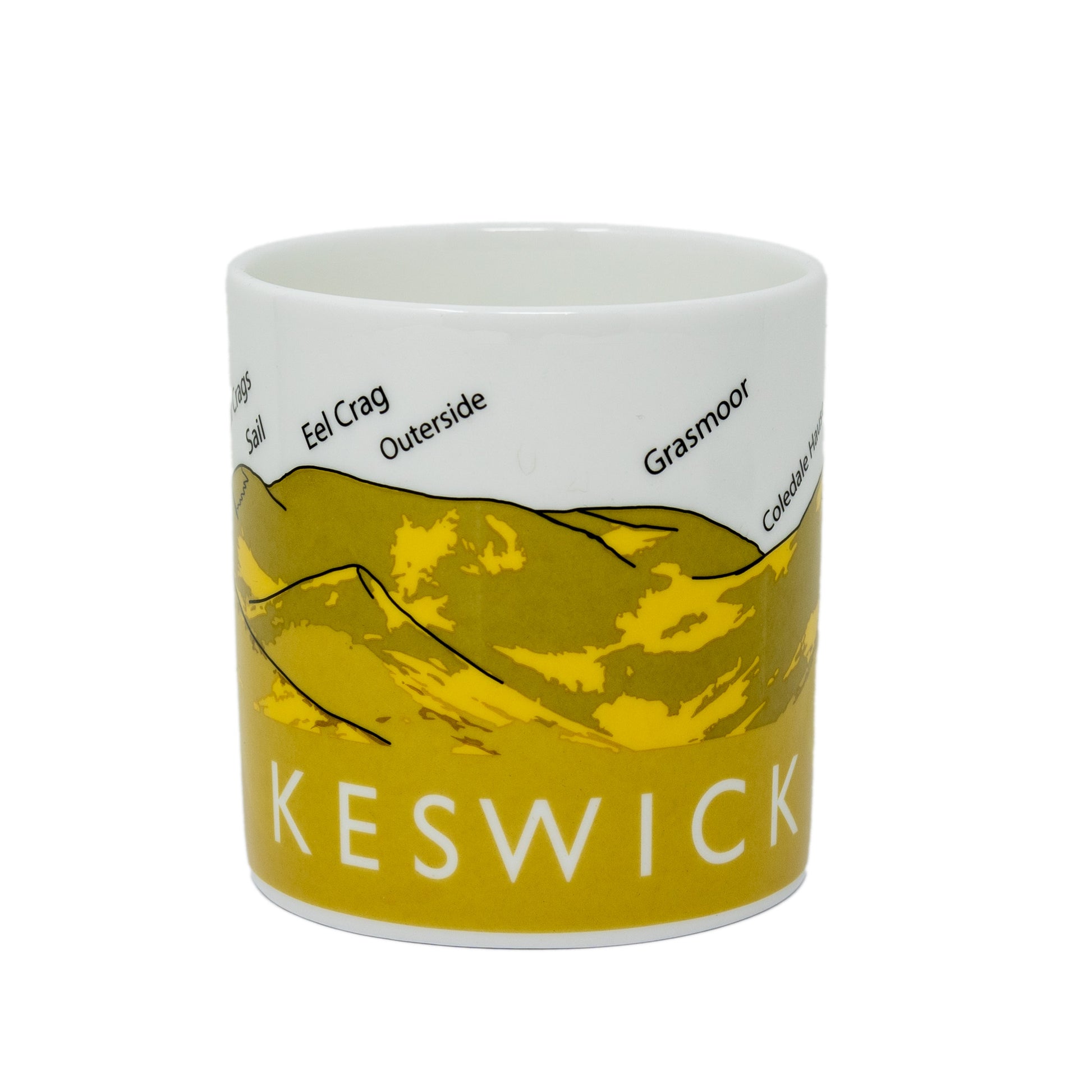 Keswick is the main town in the northern Lake District, to the west lie the Coledale fells and their familiar skyline is easily visible from Keswick. The Coledale Horseshoe is a fabulous walk and the fells contained on it are depicted on this mug.